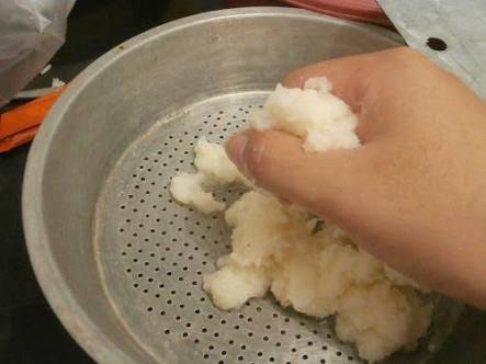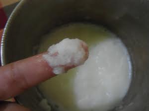Lalu campurkan pati yang sudah didapatkan dengan tepung beras. Keringkan di bawah sinar matahari. Setelah cukup kering, tambahkan minyak zaitun.