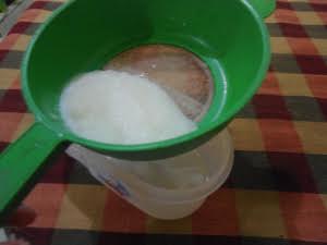 Selanjutnya, peras air bengkoang agar tersisisa bulir-bulir bengkoangnya saja. Endapkan sari bengkong itu selama 1 malam.