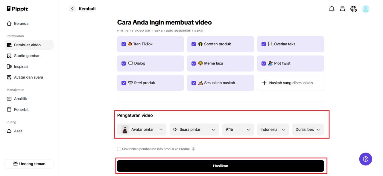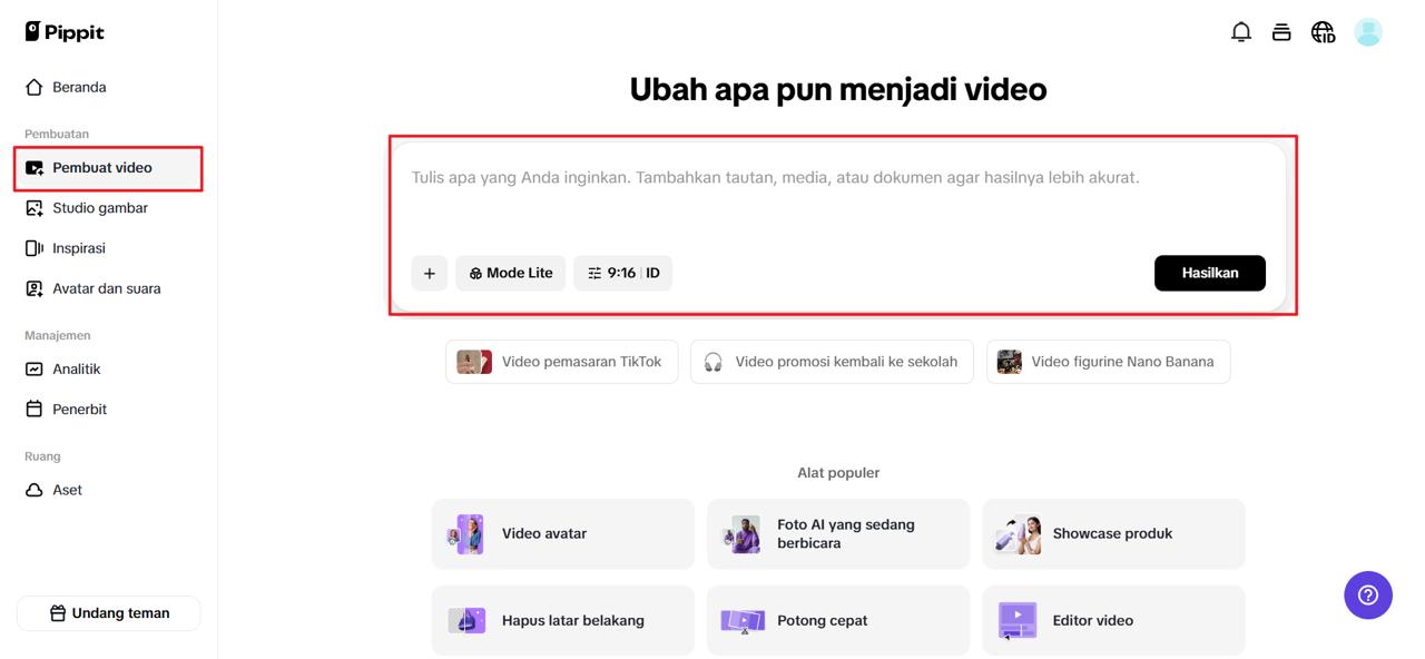 Pippit membuat prosesnya lebih mulus dari sebelumnya, menawarkan pembuatan cepat, penyuntingan mudah, dan keluaran berkualitas tinggi yang bisa kamu gunakan di seluruh platform.