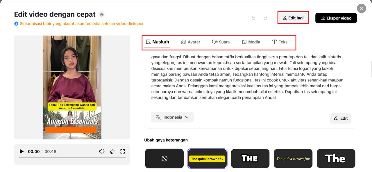 Pilih video favoritmu setelahnya dan tekan Sunting cepat untuk melakukan perubahan penting: ubah gaya takarir, naskah, atau karakter pengisi suara. Atau, kamu bisa menekan Sunting lebih lanjut untuk masuk ke antarmuka penyuntingan, di mana kamu bisa menyunting subjek di klip, menambahkan efek suara, warna, dan detail video, serta banyak fungsi penyuntingan lainnya.