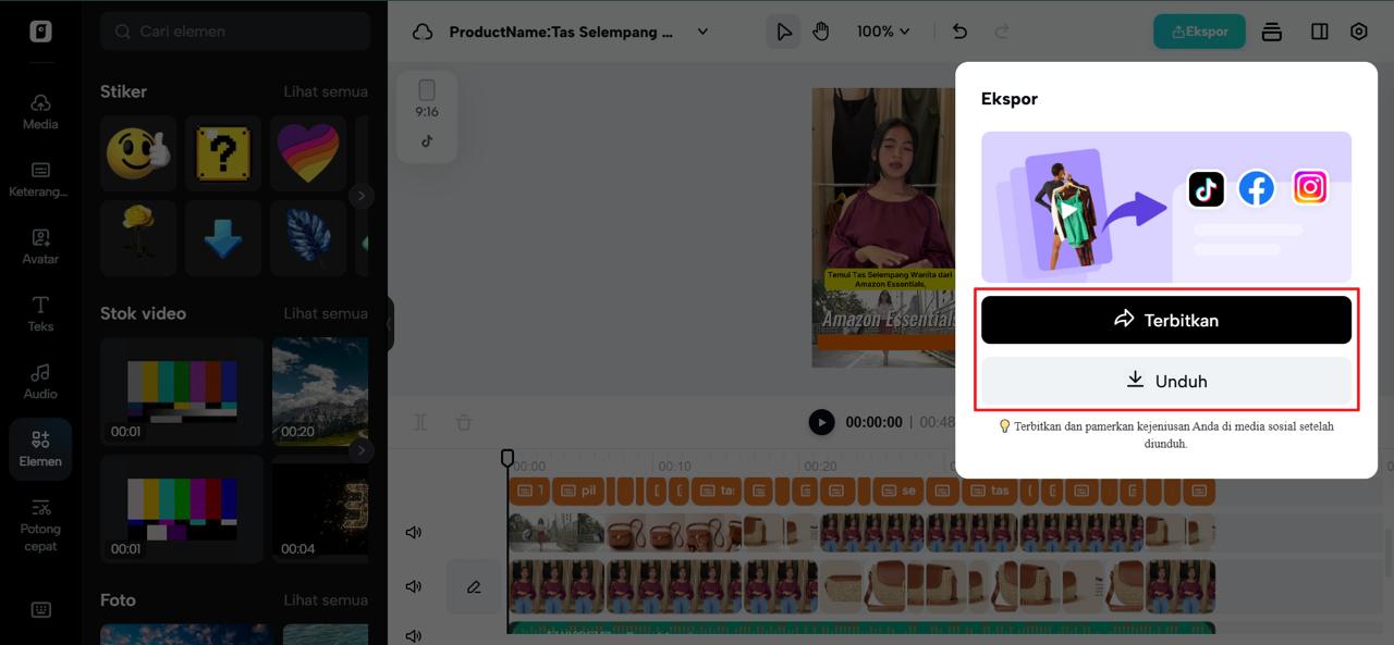 Akhirnya, tekan Keluarkan di pojok kanan atas antarmuka penyuntingan Pippit, pilih Unduh, atur resolusi, laju bingkai, kualitas, dan format, lalu tekan Keluarkan untuk menyimpan video. Atau, tekan Terbitkan, konfigurasi, dan bagikan konten langsung ke TikTok, Facebook, atau Instagram.