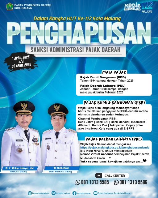MALANGVOICE – Momentum Hari Ulang Tahun (HUT) ke-112 Kota Malang dimanfaatkan Pemerintah Kota Malang untuk memberi kado bagi masyarakat. Melalui Badan Pendapatan Daerah Kota Malang (Bapenda), pemkot resmi menghapus sanksi administrasi pajak daerah sepanjang April 2026.