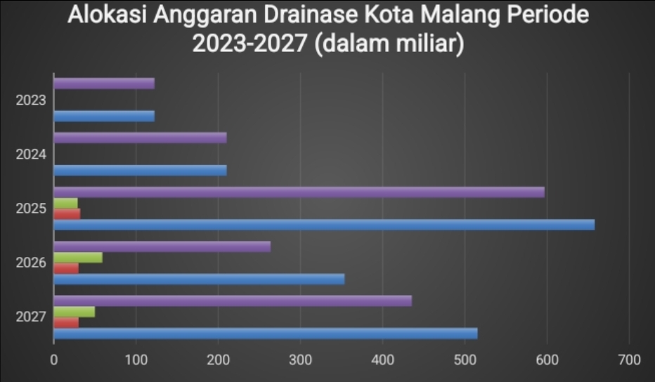 Akan tetapi, Pemerintah Kota Malang melalui Dinas Pekerjaan Umum dan Penataan Ruang kembali menggunakan revitalisasi drainase untuk menanggulangi banjir. Melalui Masterplan Drainase Kota Malang 2022-2028, Pemerintah Kota Malang memasang target kebutuhan anggaran sekitar Rp 1,86 triliun untuk revitalisasi seluruh jaringan drainase di Kota Malang dari tahun 2023 hingga 2027(Dinas PUPR Kota Malang, 2022). Alokasi yang terdiri dari tiga komponen – yaitu APBD Kota Malang, APBD Provinsi Jawa Timur, dan hibah dari lembaga internasional – dan semua komponen ini digunakan untuk pengerjaan strategis seperti revitalisasi drainase eksisting, pembangunan drainase baru, hingga pengerukan sedimen sampah. Rincian dari alokasi anggaran tahunan untuk pembangunan drainase sepanjang 2023-2027 – tahun 2026 hingga 2027 hanya dijabarkan proyeksi anggaran – tertuang dalam grafik sebagai berikut: