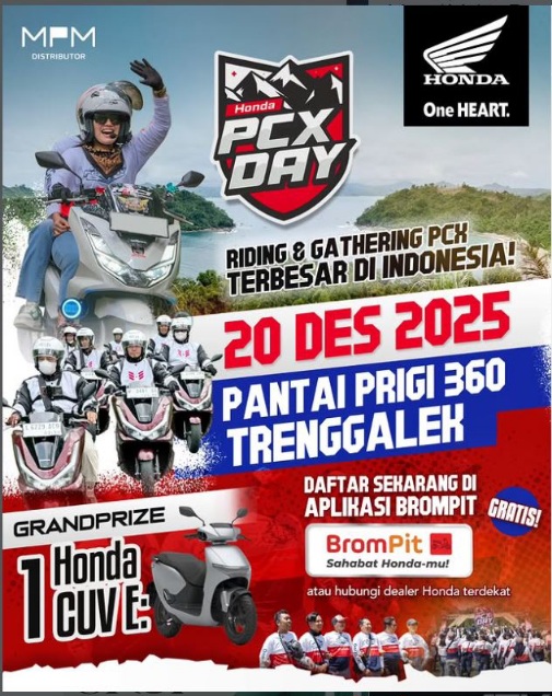 Pendaftaran Honda PCX Day 2025 dibuka gratis melalui aplikasi Brompit. MPM Honda Jatim mengajak seluruh pengguna Honda PCX, komunitas, dan masyarakat umum untuk bergabung merasakan keseruan riding bersama menuju Pantai Prigi 360 sekaligus membawa pulang berbagai hadiah menarik.(der)