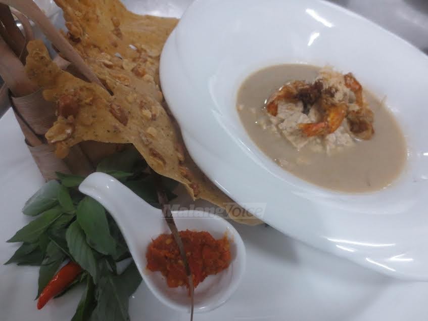 Ketupat yang disajikan dengan orem – orem tempe khas Malang yang disajikan dengan udang goreng renyah, sambal hijau dan rempeyek germut.