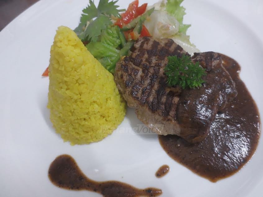 Steak daging panggang has dalam dari Australia yang juicy, disajikan dengan sayuran dan saus gaya Hindia – Belanda 1930 dan nasi kuning.