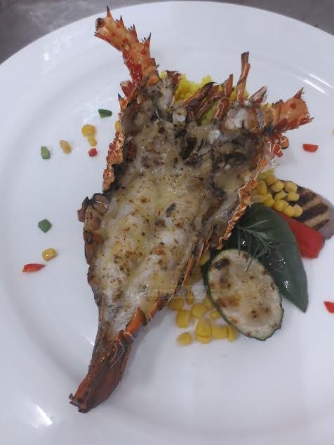 Lobster panggang disajikan dengan sayuran dan nasi kuning yang guring dan harum.
