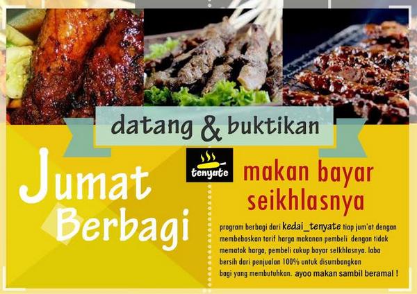Dengan menu andalan sate buntel dari daging kambing empuk dan nikmat, Tenyate mempunyai paket sedekah bagi pelanggan, terutama tiap hari Jumat, dengan label ‘Jumat Berbagi’.