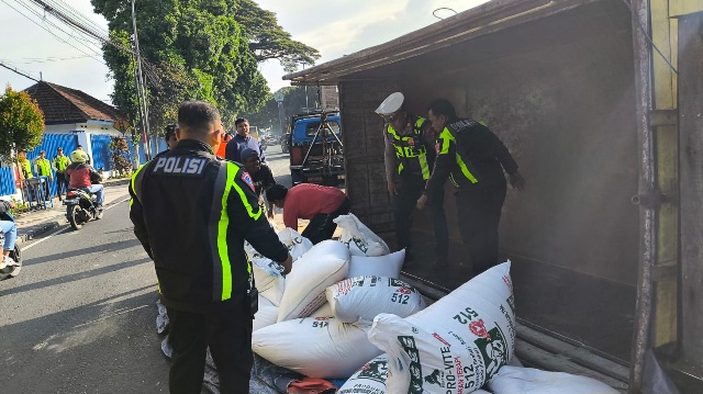 MALANGVOICE – Kecelakaan lalu lintas terjadi di Jalan Raya Balearjosari, Blimbing, Kota Malang, Jumat (3/4) pagi. Sebuah truk bermuatan pakan ayam seberat 8 ton terguling di badan jalan dan sempat memicu kemacetan panjang.